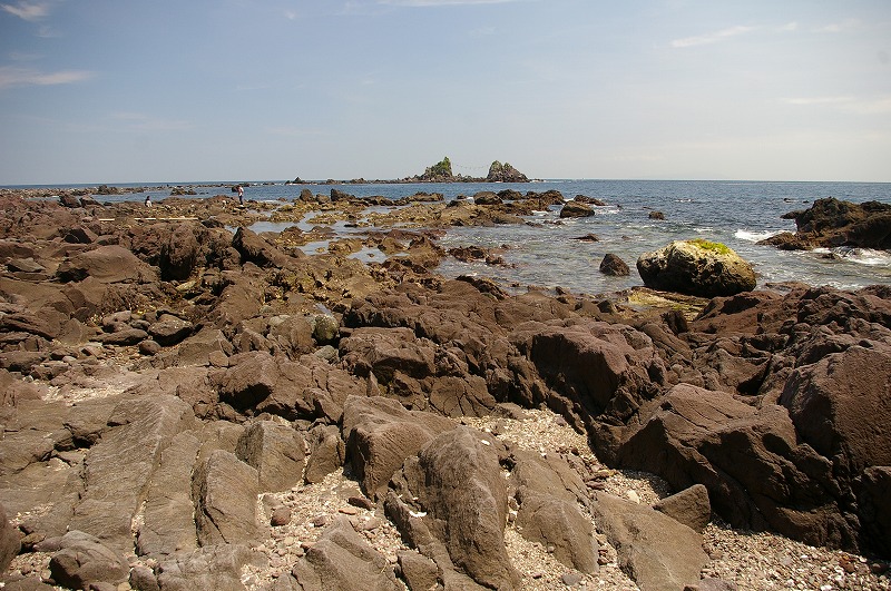 真鶴のシンボルともいえる、三ツ石海岸。浜辺から約200mに渡って続く岩礁の先に、3つの巨大な岩が顔を出しています。