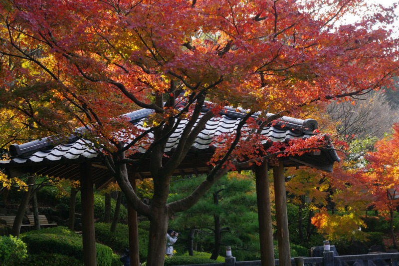 新緑の樹林やもみじに映える池や流れ、また園内を彩る四季の草花やお茶室庭園の紅葉が、