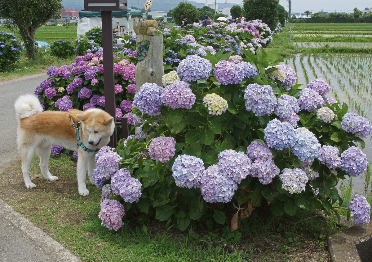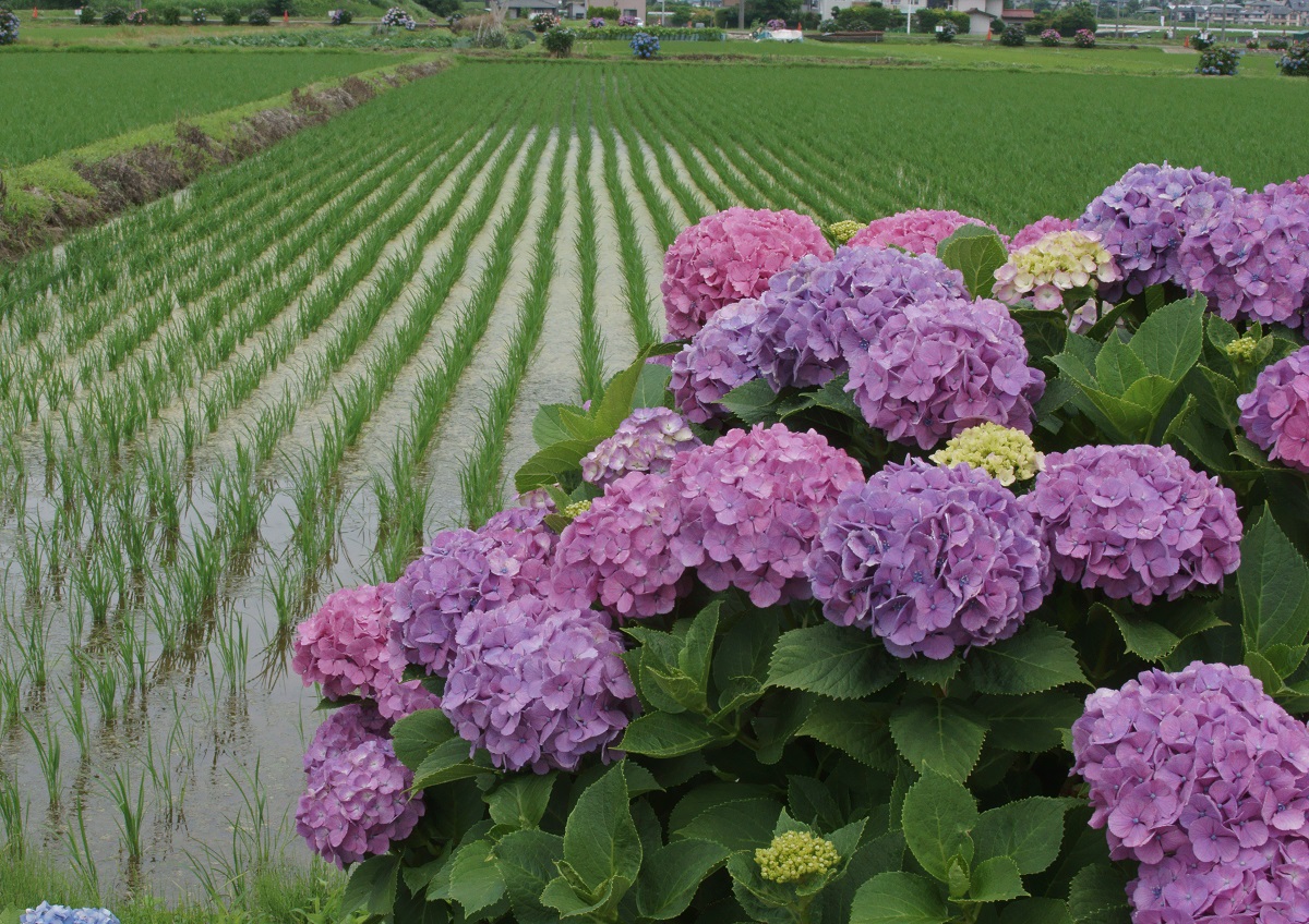 青々とした水田を背景に、あじさいの花の色がひときわ映えて見えます。