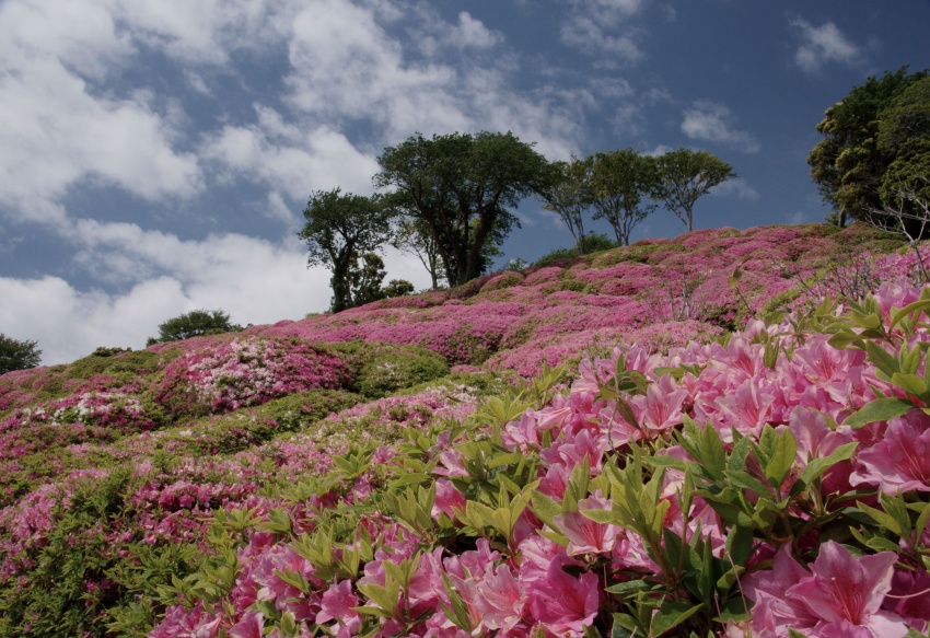 期待十分と緩やかな坂を上がると、大きなあずまや越しに岡の上に広がるツツジが見える。