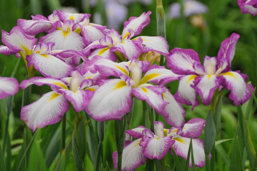 あい、紫、ピンク、黄、白など、色とりどりにあでやかに咲き競っている。