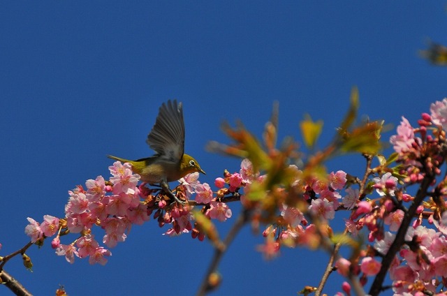 3月の初旬は河津桜の見頃です、桜の枝にはメジロやヒヨドリも見る事が出来ます。