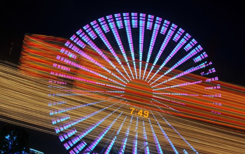 横浜みなとみらい21の夜景撮影、横浜コスモワールドからコスモクロックを撮影。
