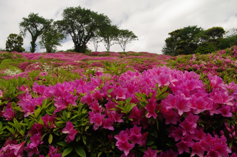 期待十分と緩やかな坂を上がると、大きなあずまや越しに岡の上に広がるツツジが見える。