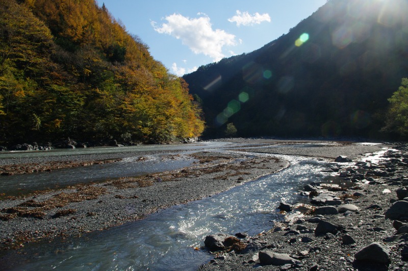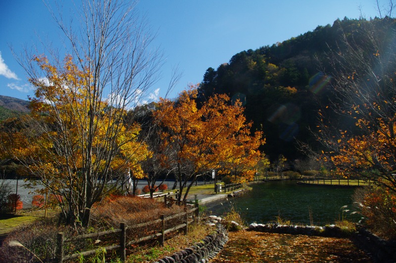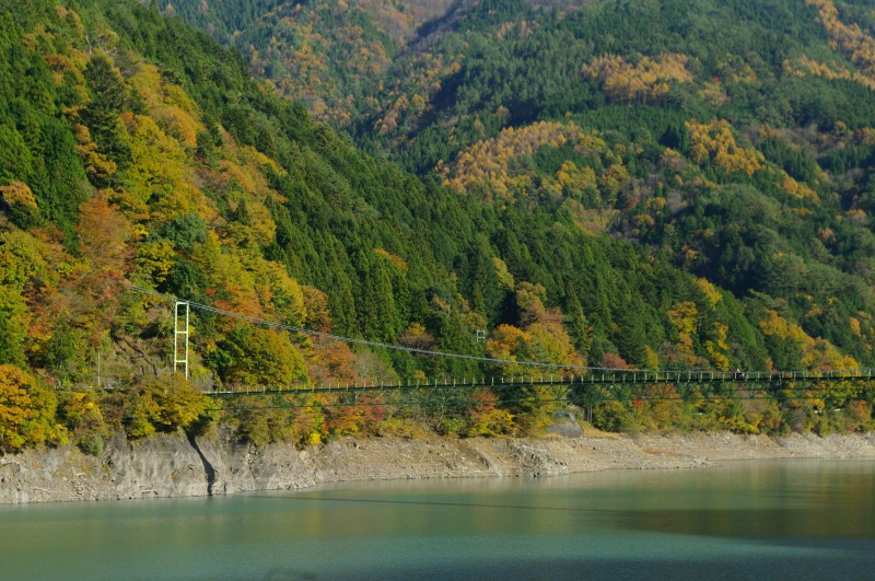 ダム湖を囲む山々がいっせいに色づく。湖にうつる南アルプスの紅葉が素晴らしい。