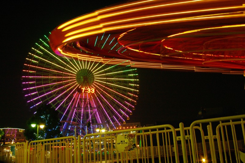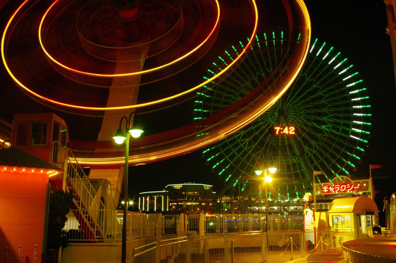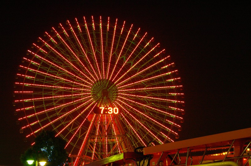 横浜みなとみらい21の夜景撮影、横浜コスモワールドからコスモクロックを撮影。