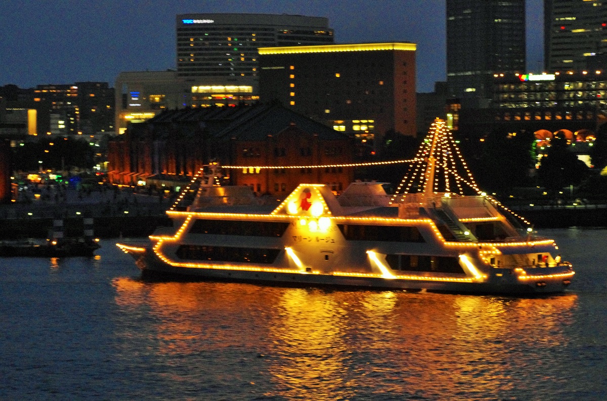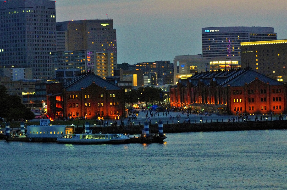 横浜みなとみらい21の夜景撮影、横浜大桟橋から赤レンガ倉庫とコスモクロックを撮影。