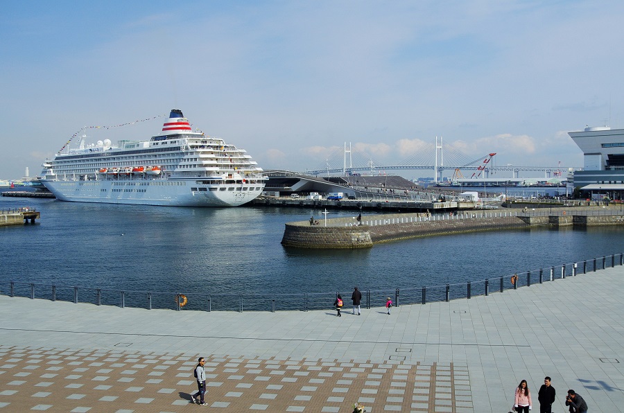 横浜港を眼前に見る最高のロケーション、港独特の雰囲気大桟橋からの眺望、港みらい21やベイブリッジ。